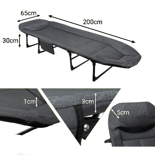 Materac i napięty materiał Oxford dopasowują się do ciała, oferując komfortowy sen zarówno w domu, jak i w terenie. Po złożeniu łóżko polowe jest kompaktowe i lekkie, co ułatwia przechowywanie i transport w bagażniku lub schowku. Kieszonka boczna umożliwia wygodne przechowywanie najpotrzebniejszych rzeczy, takich jak telefon, książka czy pilot, zawsze w zasięgu ręki.